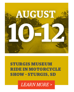 STURGIS, SD-RALLY:AUG 3-12 RIDE IN SHOW: AUG 10-12 It's that time again. The 80th Sturgis Motorcycle Rally, the pilgrimage that belongs on every rider's bucket list. This year, we're especially excited by the Ride-In Motorcycle Show sponsored by the Sturgis Motorcycle Museum. See you there.